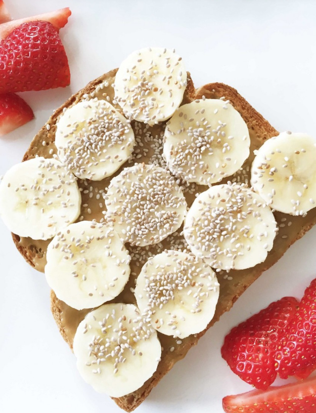 Это очень просто и быстро: взять хлеб (вкуснее если вы его подсушите в тостере или на сковороде) и намазать его ореховой пастой (одной столовой ложки хватит), потом произвольно нарезаете банан и кладете сверху. Если хотите, то присыпьте семенами чиа или кунжутом, можно семечками, минадальными лепестками, кокосовой стружкой или солью.